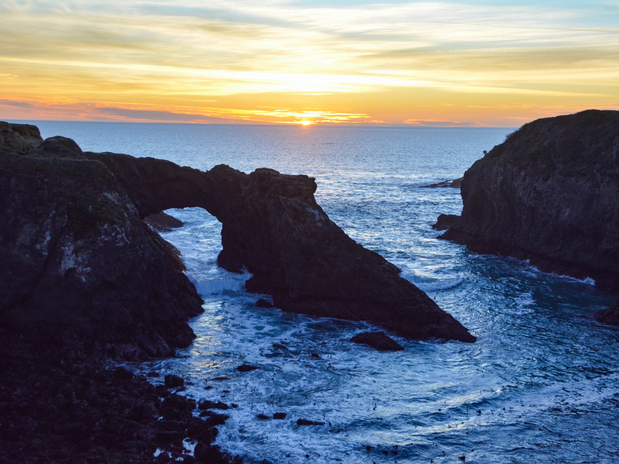 After visiting the falls, I backtracked to the car and drove back into Mendocino proper (less than a 10 minute drive). Following signs for Mendocino Headlands State Park, I ultimately turned onto Heeser Drive. There are several places to park along this road that overlook the ocean. The sunset was gorgeous on the day I visited, and you could even spot a whale off the coast if you looked closely! The rock formations seemed most beautiful to photograph just before or just after sunset, when the direct light from the sun was more obscured, but it was equally compelling to just breathe in the sea air and listen to the waves crash against the rocks.