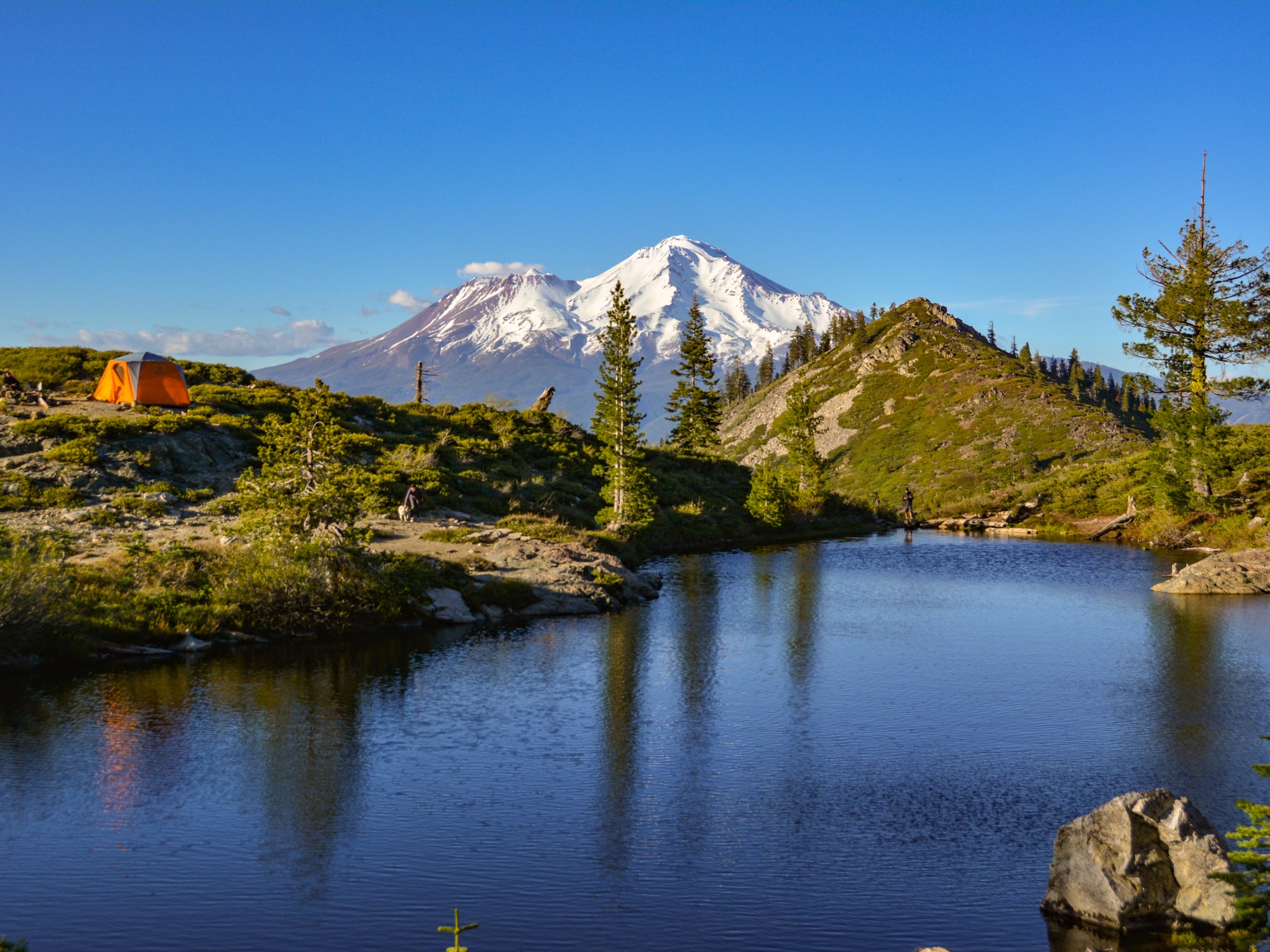 The end of the trail provides a nice peek at the peaks (both the Crags and Mount Shasta), and a great spot for a selfie or just to enjoy the sun setting against the mountain.
