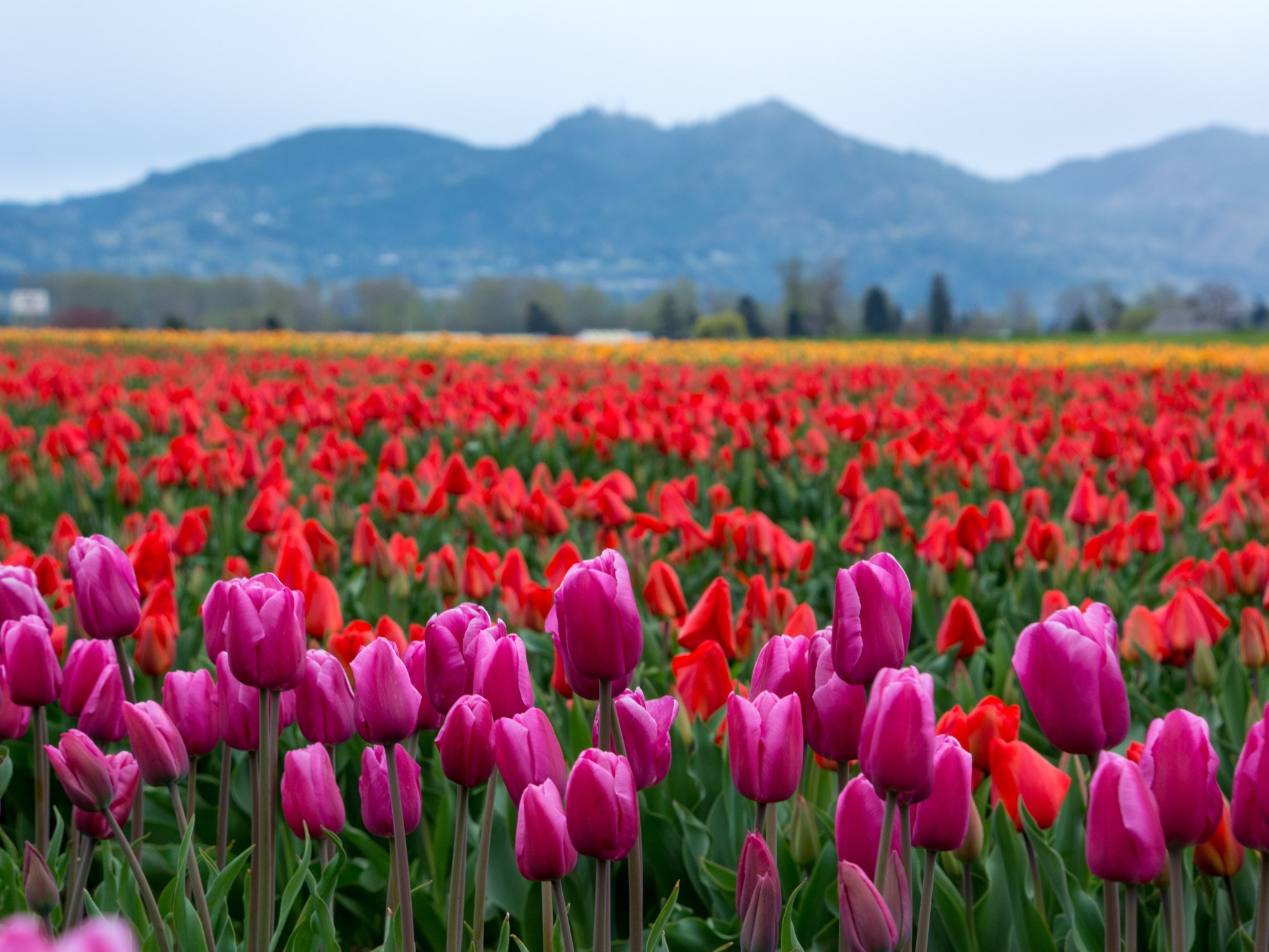Many of the fields that bloom during the tulip festival belong to Roozengaarde, the farm of the Roozen family, who has been growing tulips in Holland and the US since the 1700s! We’d recommend visiting the farm’s main 5-acre display garden as soon as they open in the morning (9AM) to get unobstructed and up-close views of the flowers before the crowds start to come in from Seattle. We arrived about 10 minutes before 9 and were some of the first people to get into the garden. Afterwards, you can drive around the rest of the valley to roadside pullouts to take in even more fields of flowers. The admission fee for the main garden gets you parking at all of the Roozengaarde fields around the area, and you can get your hand stamped to come back into the main garden if you’d like to visit again later in the day. Tulip Town also has fields in the area, but their fields were not in full bloom when we visited.