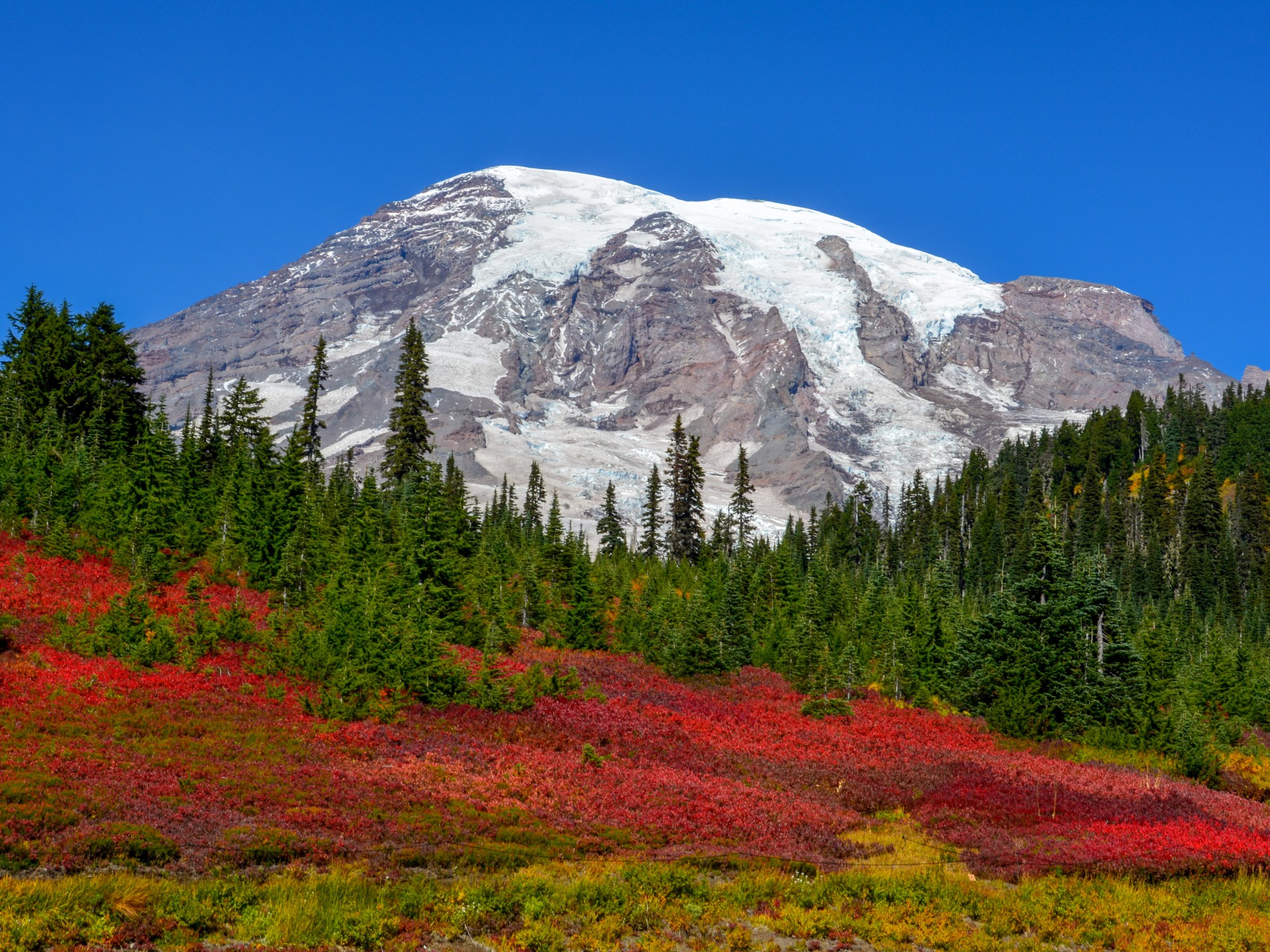 Mount Rainier is visible from Seattle and many locals consider it a bellweather: when “the mountain is out,” it is generally a sign of good weather for the entire region. We’d definitely recommend visiting when it is sunny to get the best views and hiking experience. The fall colors are brightest from the end of September until sometime in October, but there is also a good chance of snow at high elevations during this season.